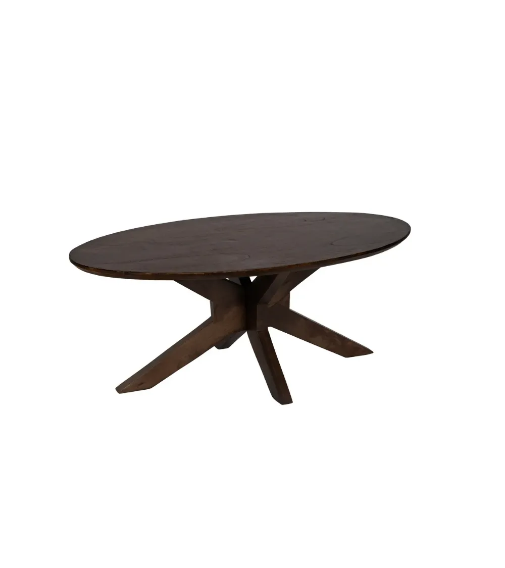 El diseño ovalado del tablero y la base entrecruzada le confieren una estética equilibrada, ideal para espacios contemporáneos, rústicos o de estilo boho. Cada mesa presenta vetas únicas que resaltan la autenticidad del material, creando una pieza exclusiva y duradera.