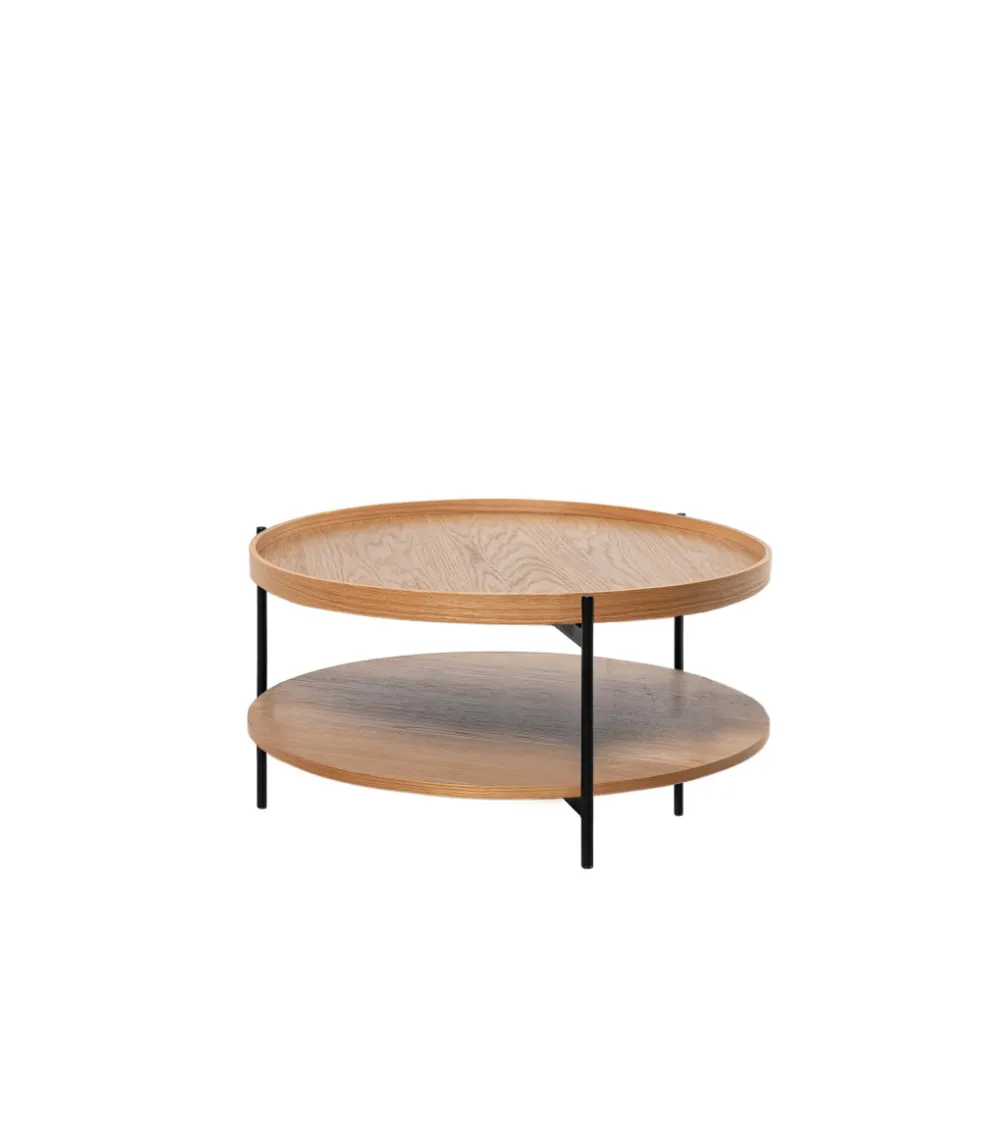 La mesa de centro Dylan, disponible en color negro o marrón, combina chapa de roble y patas metálicas en un diseño minimalista y elegante, ideal para salones modernos.