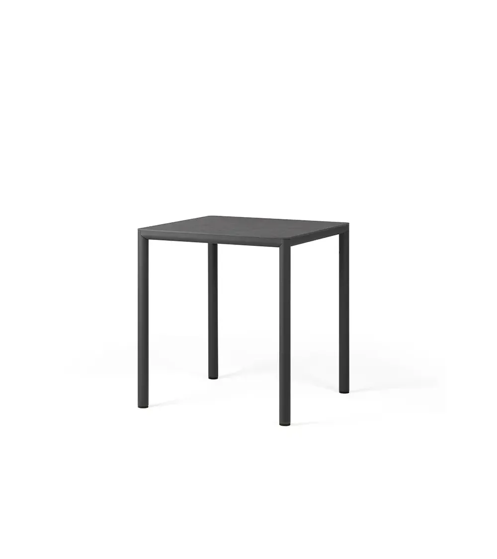 Características destacadas: Mesa de exterior fija cuadrada con tablero HPL Solid Core y patas de aluminio desección redonda. Ideal para comer 2 personas.