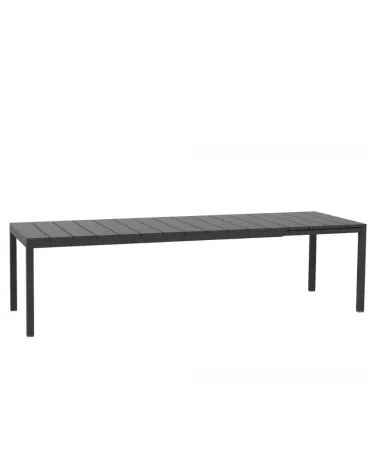 Mesa para exterior con encimera en listones de resina de DURELTOP, tratada anti uv y estructura de aluminio pintado.