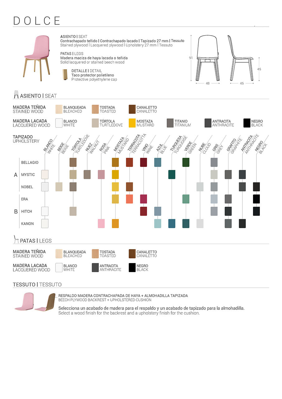 Acabados: La Silla Dolce , en versión tessuto, está disponible en todos los acabados bellagio, mystic, nobel, kanon, era y hitch. Al ser tessuto, se puede personalizar el respaldo de esta silla, eligiendo entre diferentes acabados de madera teñida o lacada.