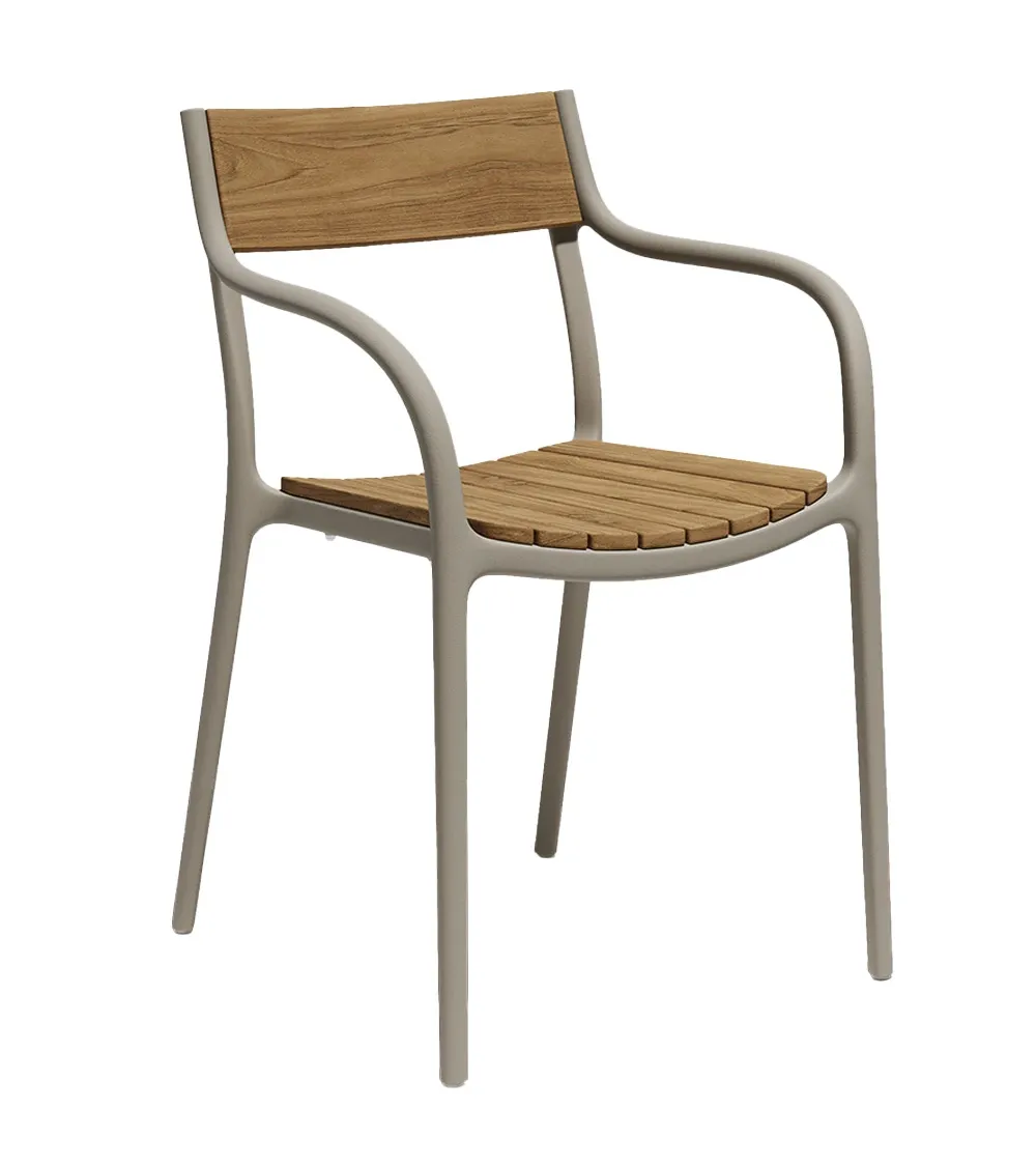 Su estructura, realizada en resina de alta resistencia, ha sido cuidadosamente diseñada para soportar las condiciones del exterior, garantizando durabilidad frente a la humedad, los rayos UV y el desgaste diario. El asiento y respaldo, formados por lámparas de madera con tratamiento especial, aportan una textura cálida y orgánica que contrasta armoniosamente con las líneas limpias y el acabado contemporáneo de su marco.