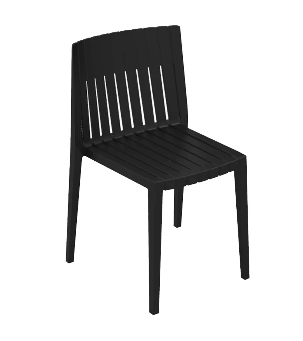 Características destacadas: Silla de diseño para exterior apilable, que destaca por su diseño de lamas verticales. Fabricada en España.